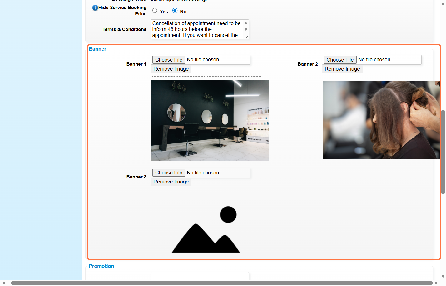 Step 4: Set “Hide Service Booking Price” to “Yes” or “No” and fill in the terms and conditions.